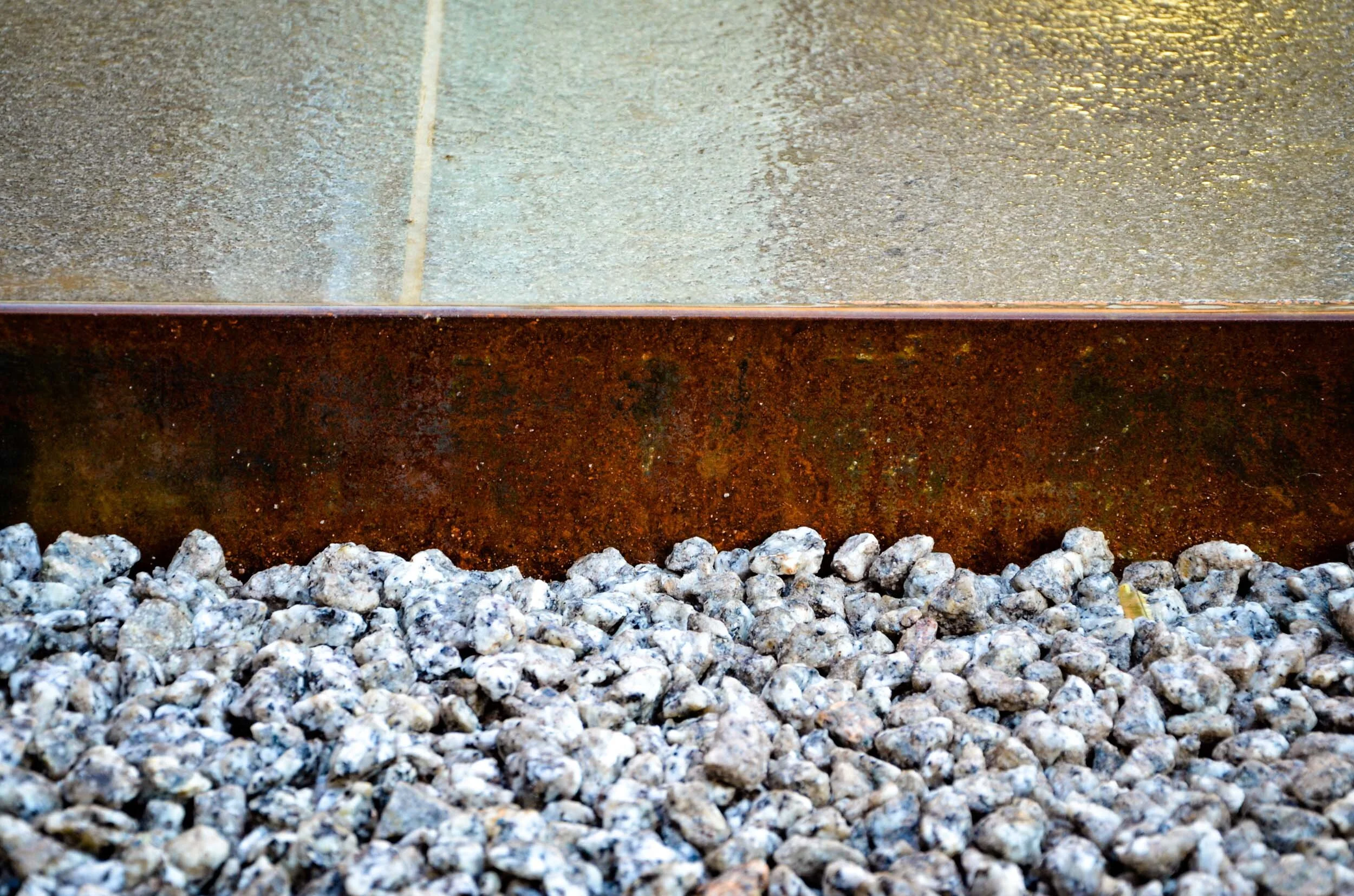 Three large standing stones sit within a simple bed of creeping thyme and act as the main focal points within the garden, standing out against the slatted timber fence. Ivy panels are used to create a green wall along the left-hand side of the boundary while three thin strips of ivy are framed within the fence at the end of the garden and compliment the standing stones. Granite paving, gravel and pebbles are all edged with rusted steel, providing a restrained and complimentary palette of materials.