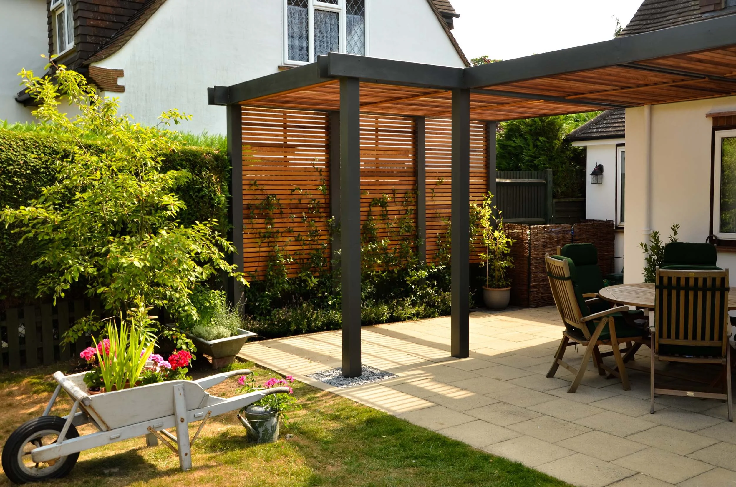 The final design was for a bespoke pergola with a dark grey frame and Wester Red Cedar slats that gave both dappled shade and privacy. These slats were extended down the side of the pergola and these act as a trellis for Star Jasmin to be grown up.